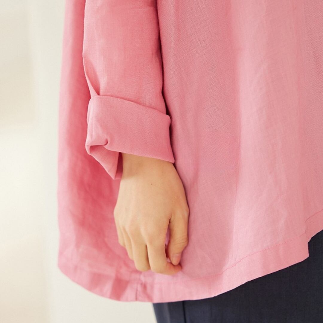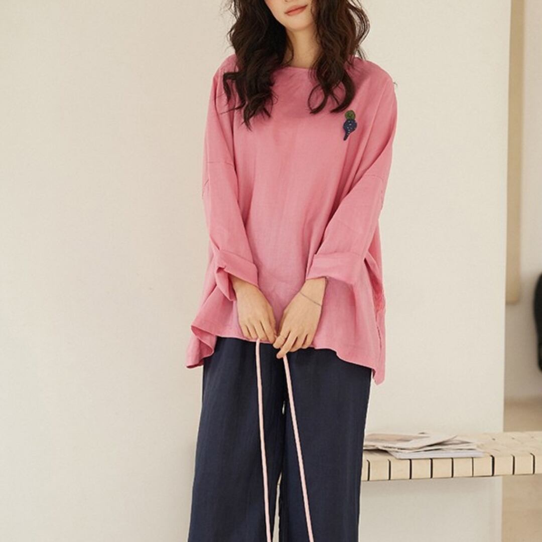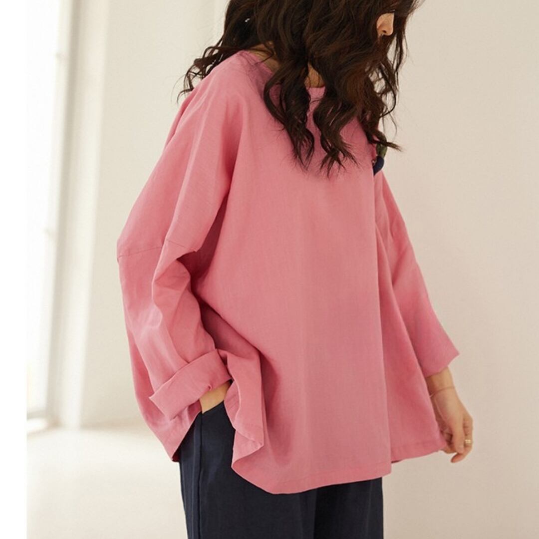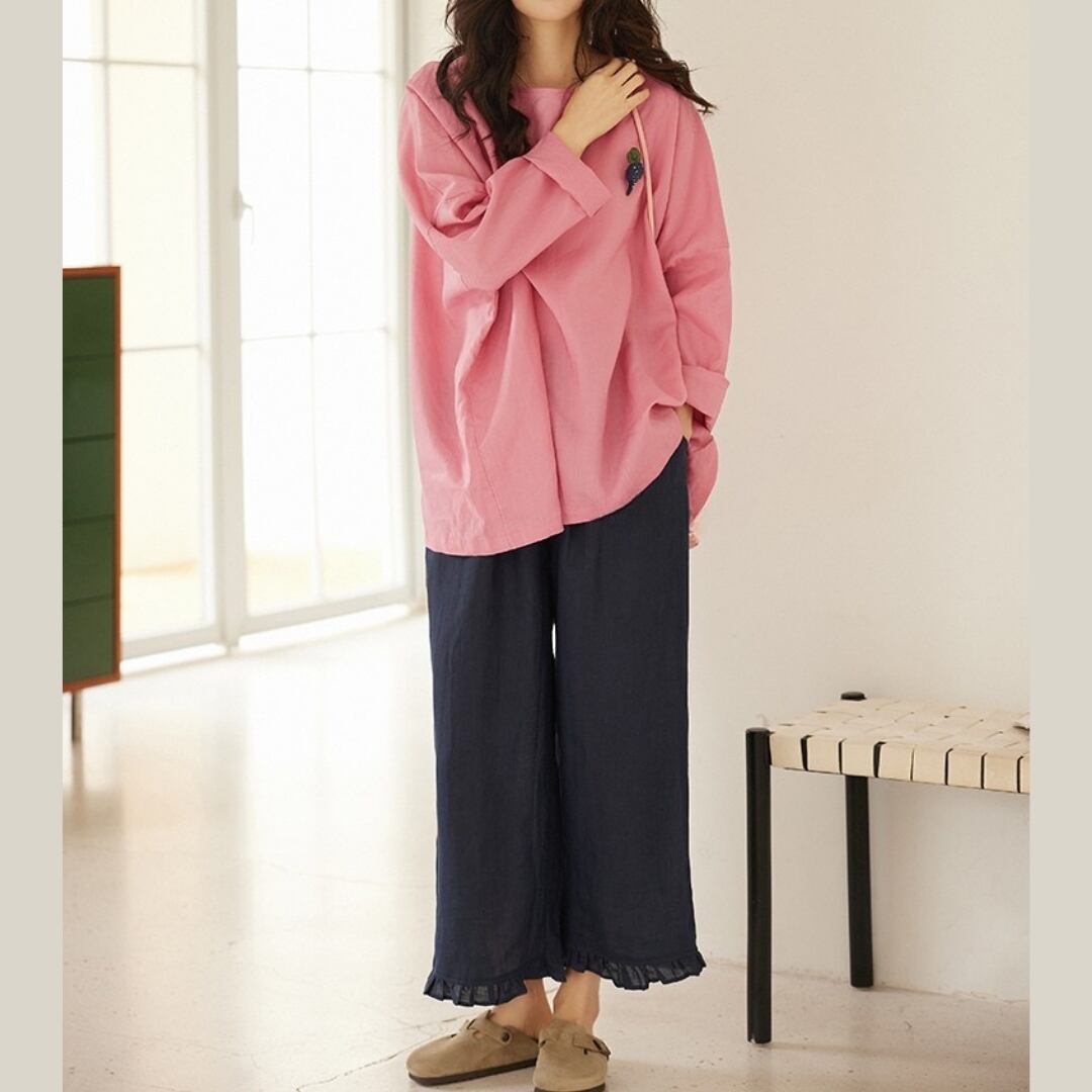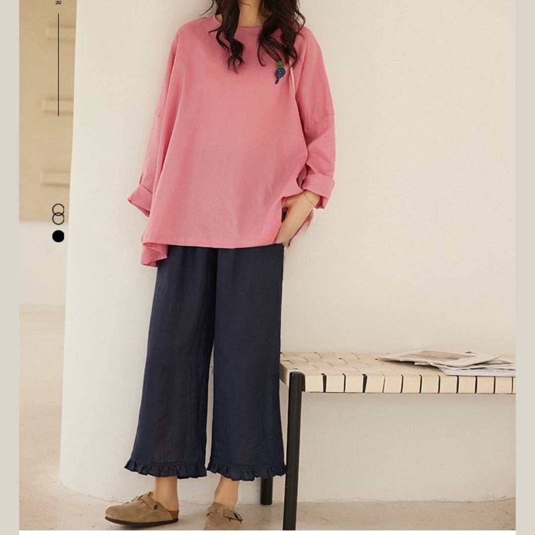 七分袖クルーネックのAラインワイドパンツセットアップ。ゆったりとしたシルエットでリラックスした着心地が魅力です。トップスはシンプルながらも、さりげないアクセントが洗練された印象を与えます。ボトムスのワイドパンツは、動きやすさとスタイルの良さを両立。普段使いはもちろん、お出かけ着としても活躍します。