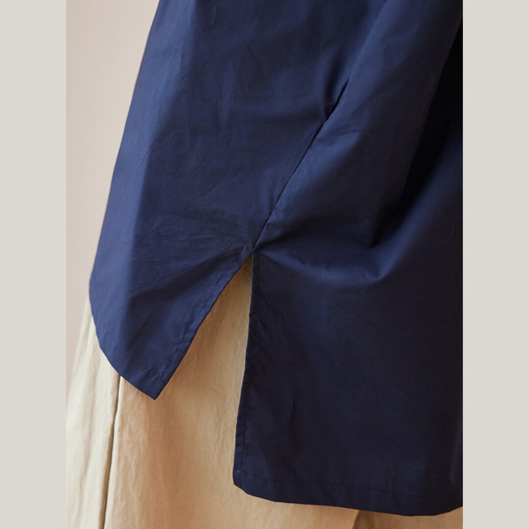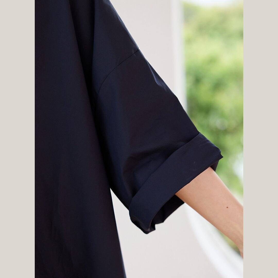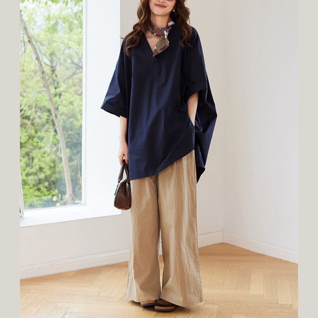 ゆったりとしたドルマンスリーブと、アシンメトリーな裾デザインが動きにニュアンスを加える、上品な大人のチュニック。