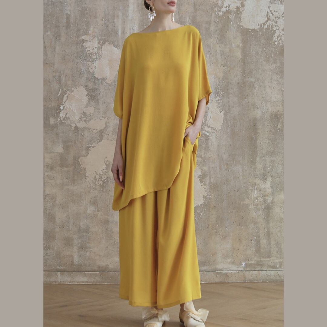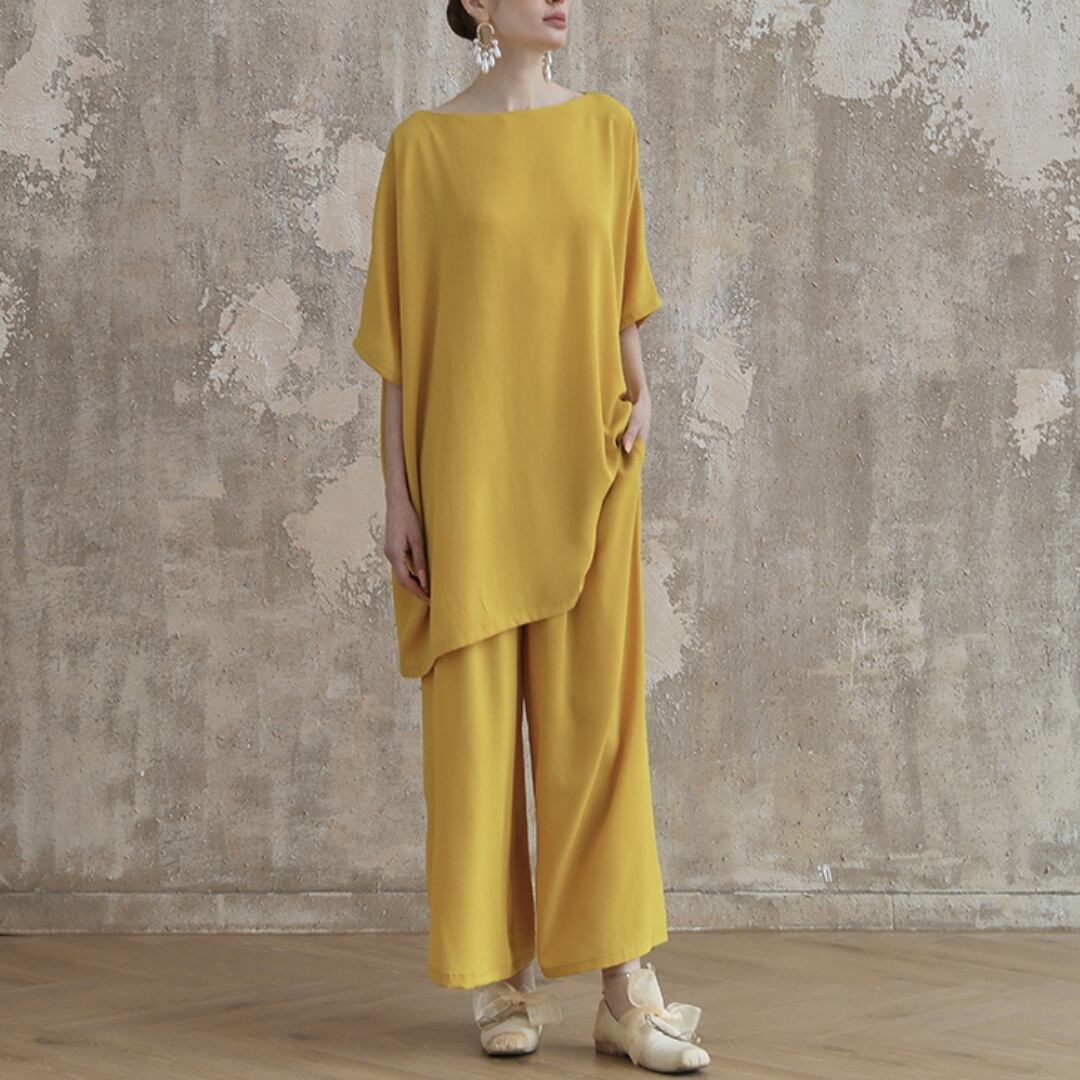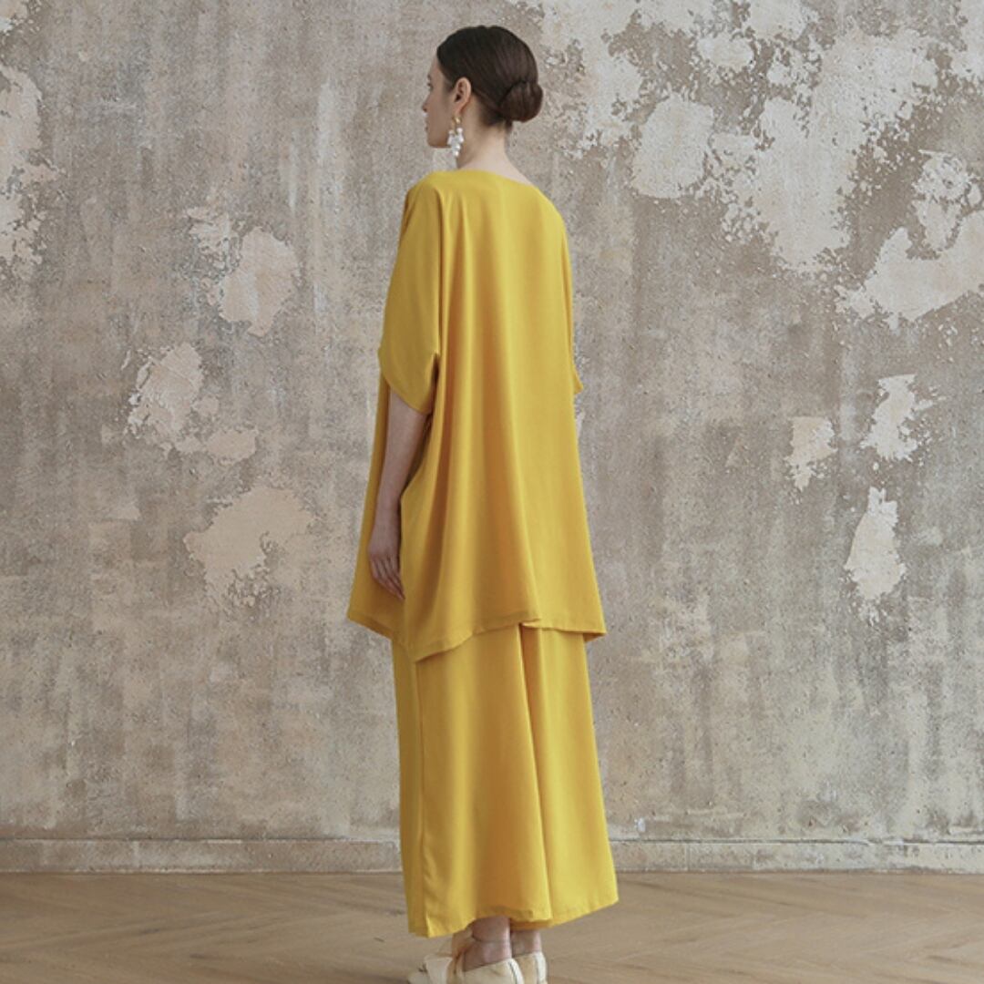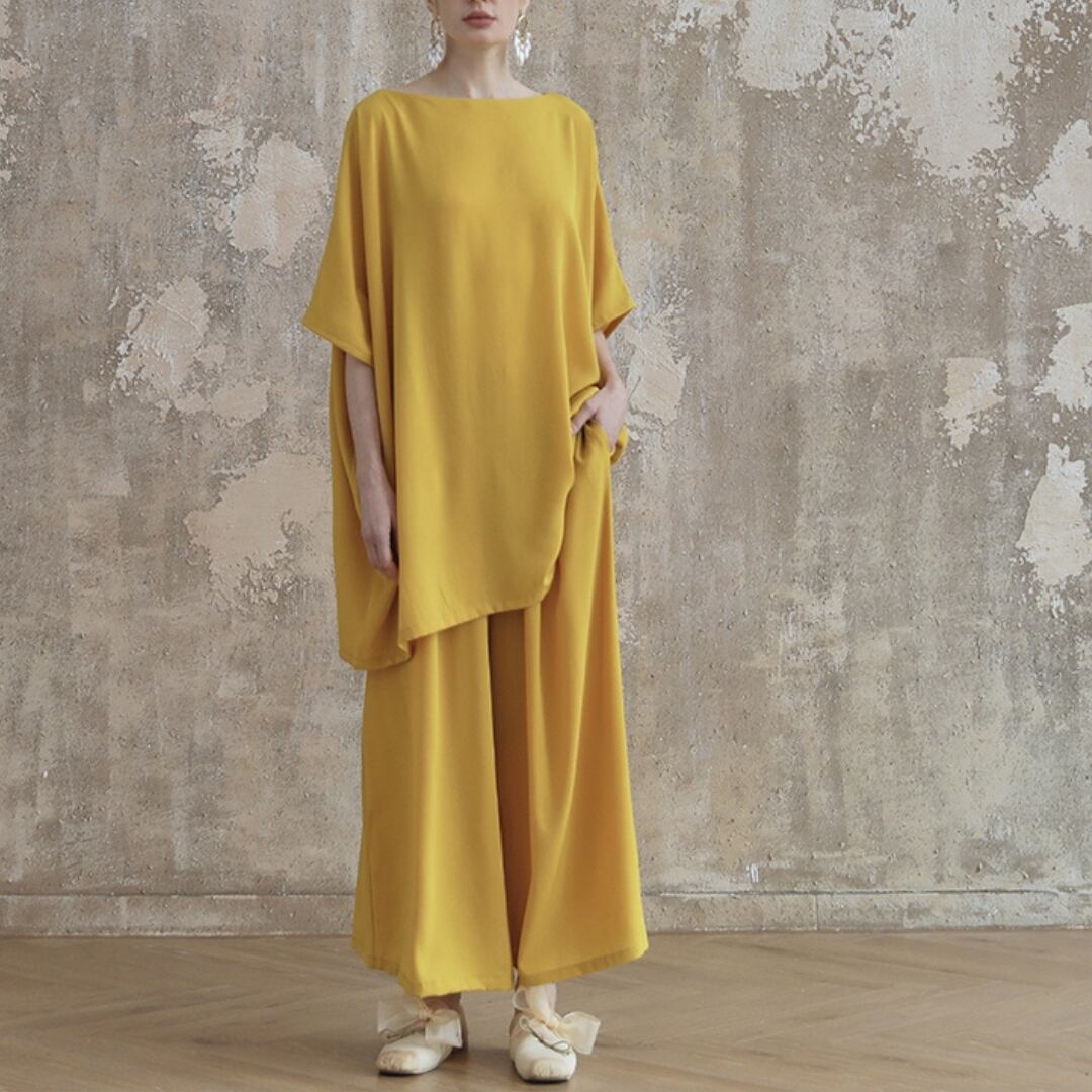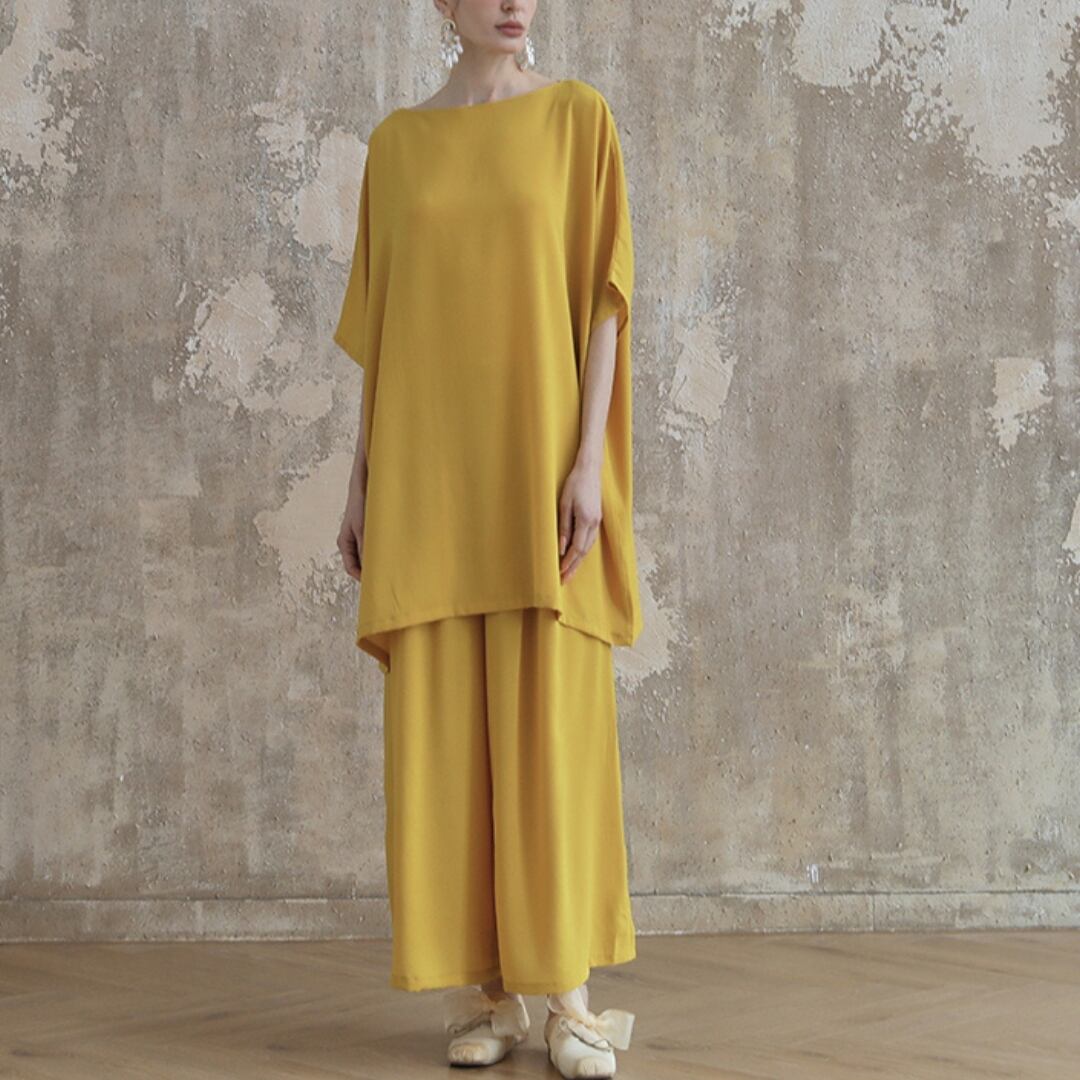 リラックス感のあるワイドシルエットと落ち感の美しいドレープが、自然体で洗練された大人の魅力を引き立てます。お出かけにも、おうち時間にもフィットするセットアップです。