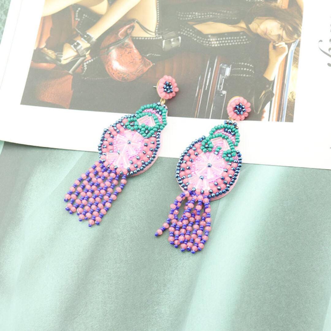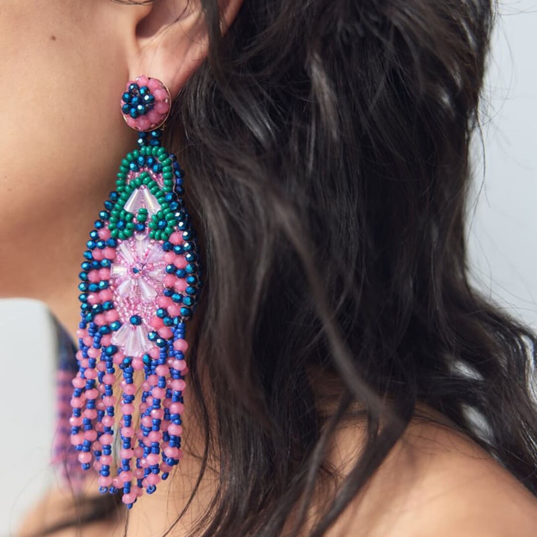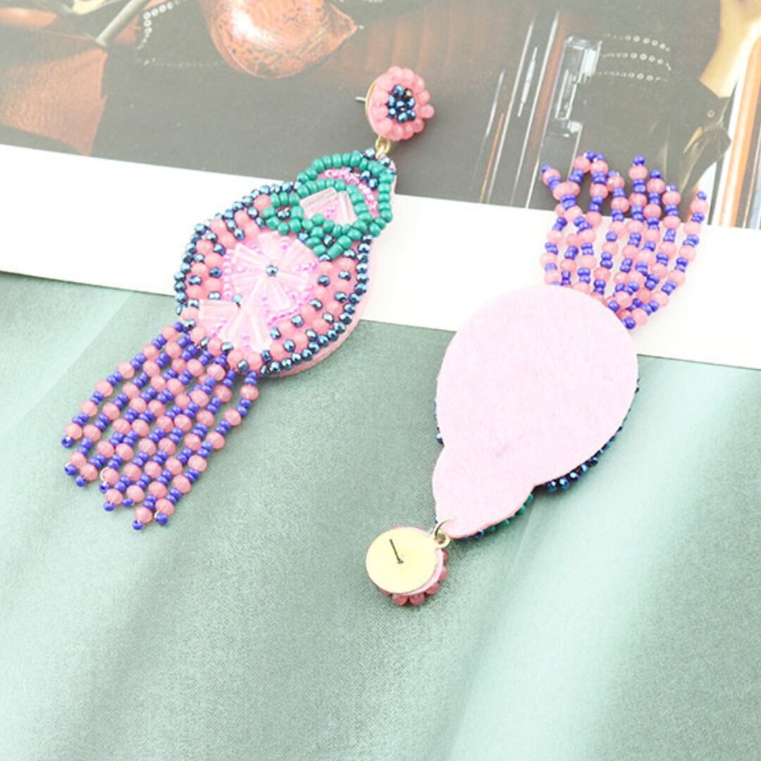 ピンク・ブルー・グリーンのビーズを贅沢に組み合わせた存在感たっぷりのデザイン。