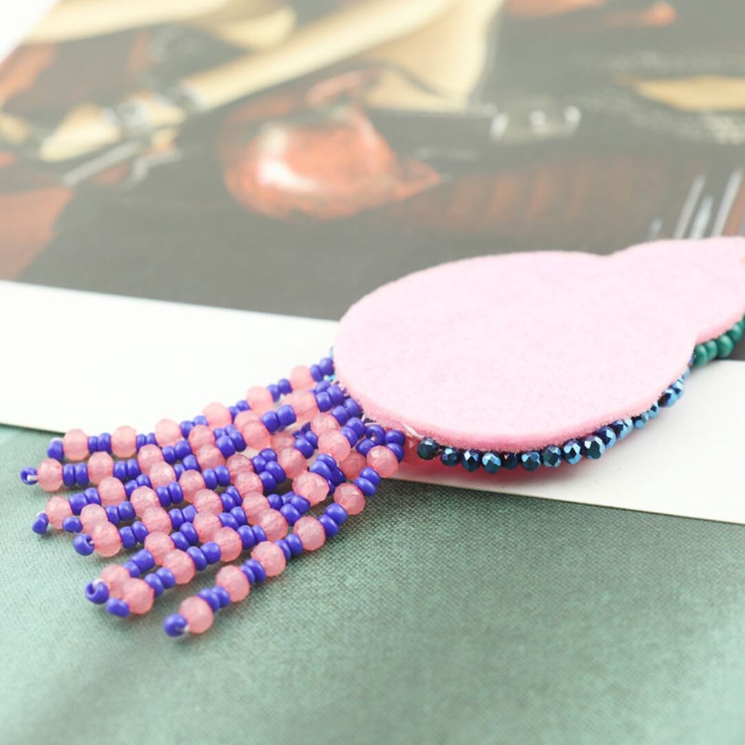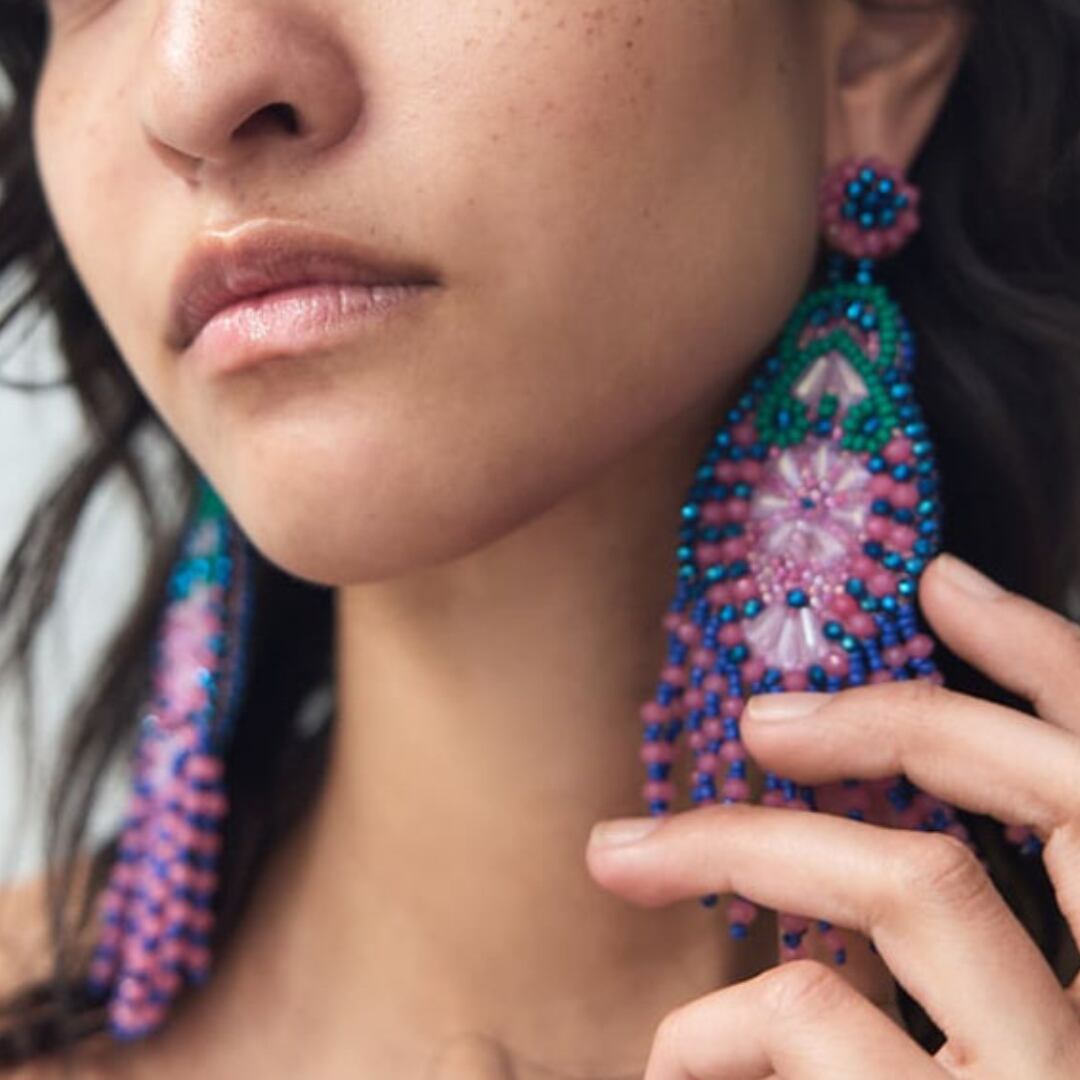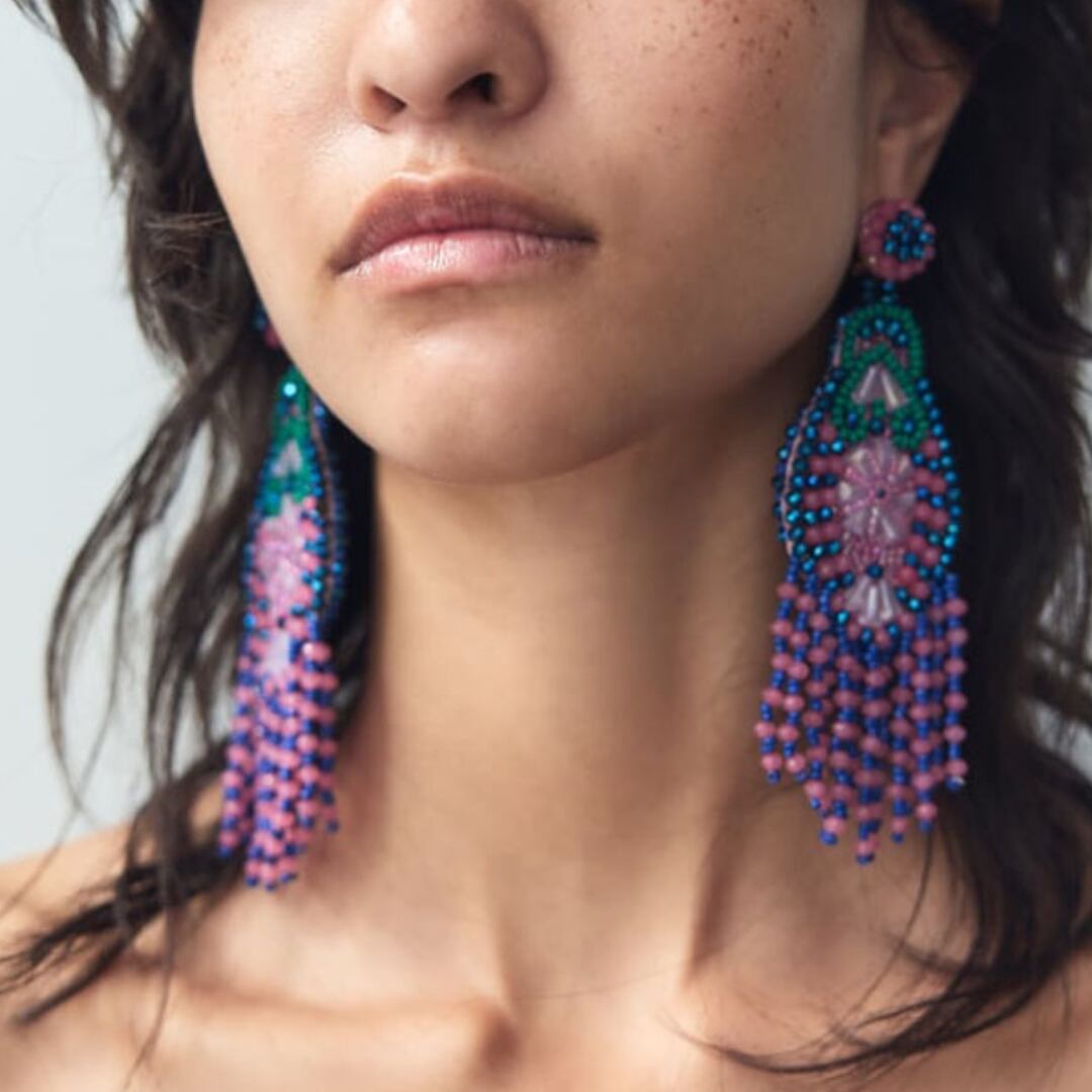 ピンク・ブルー・グリーンのビーズを贅沢に組み合わせた存在感たっぷりのデザイン。