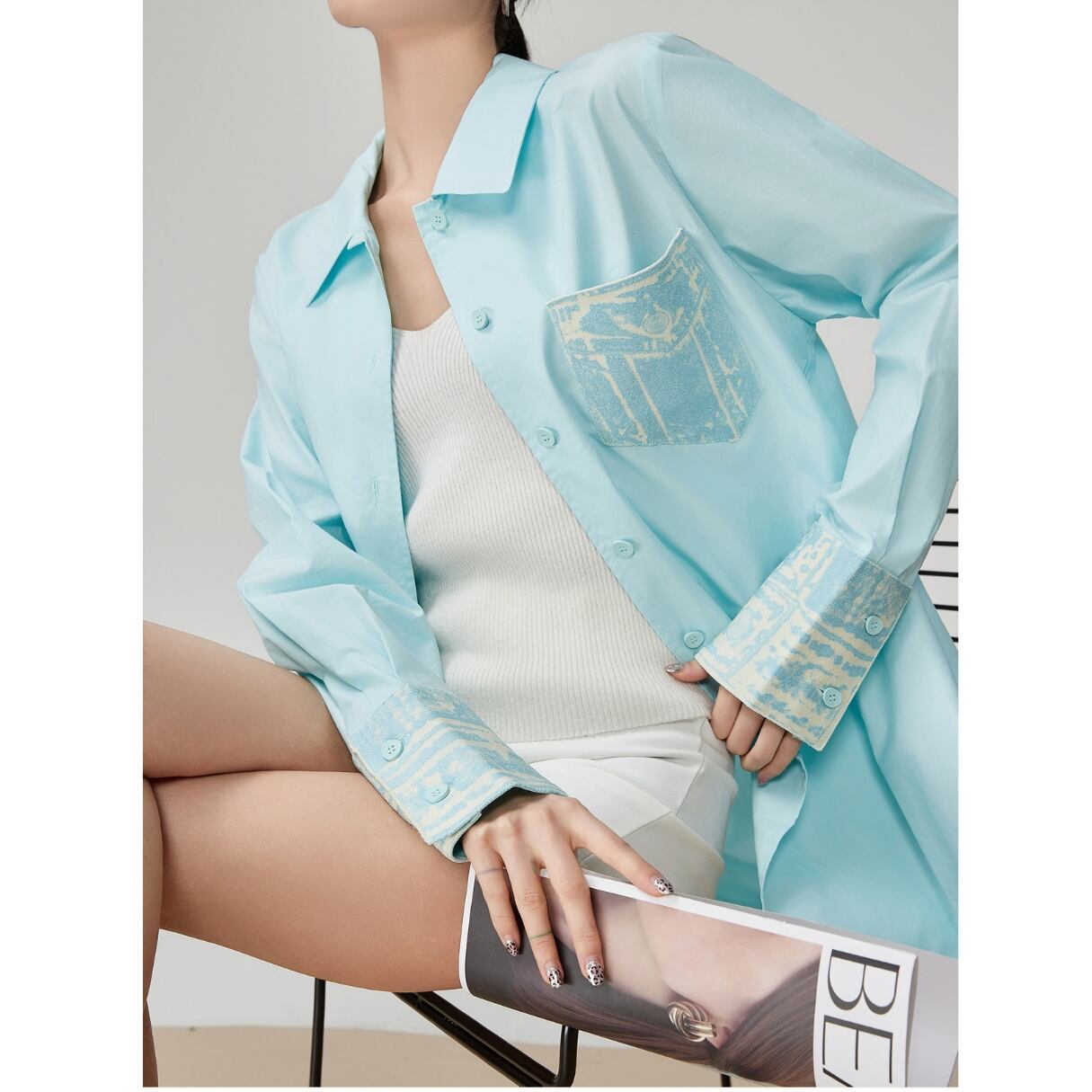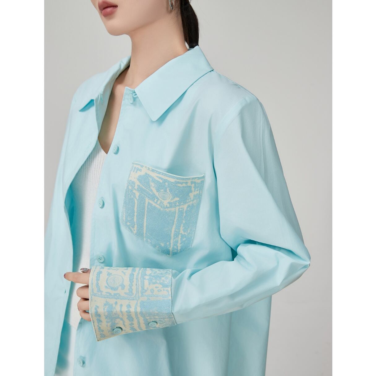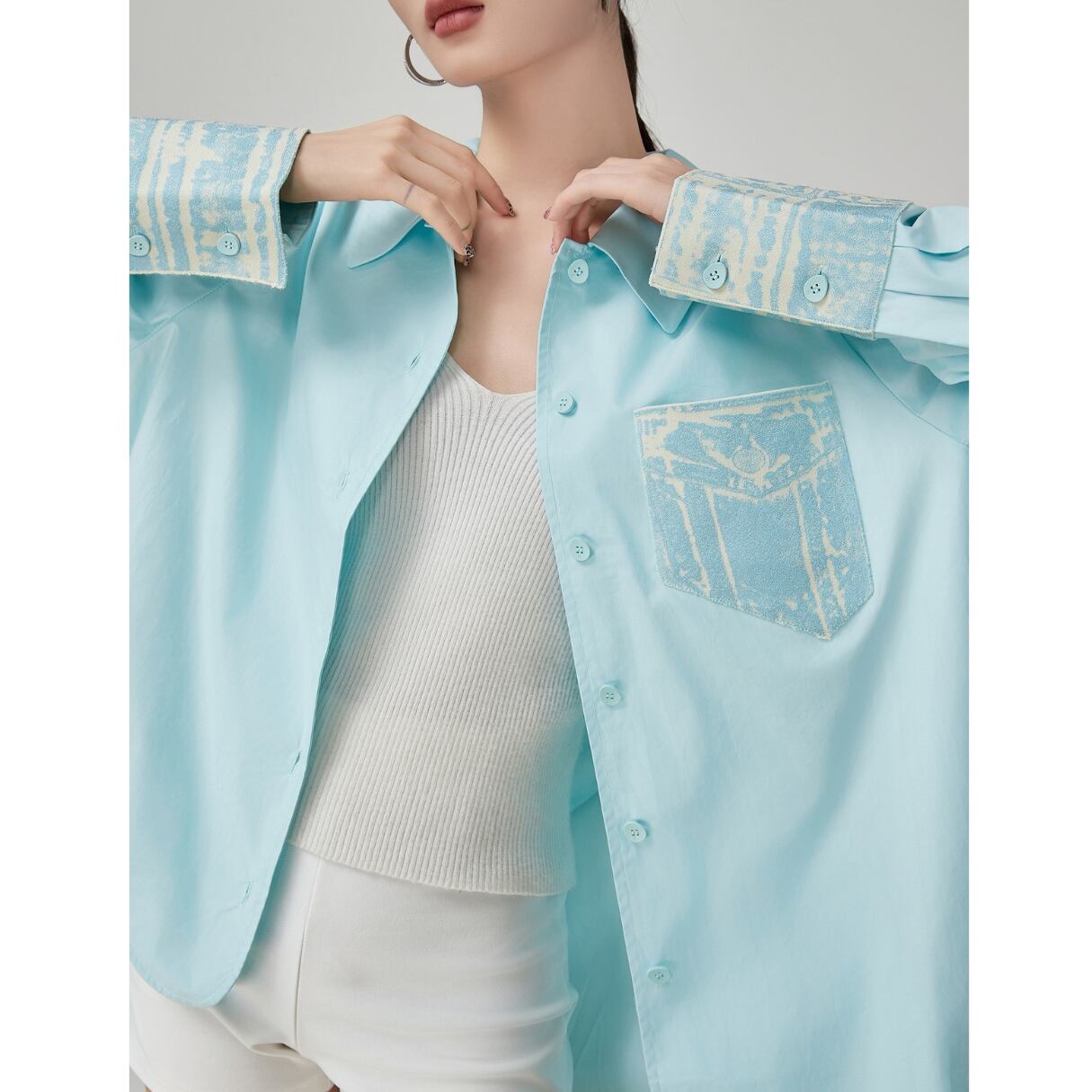 爽やかさを纏う 透き通るようなアクアブルーが、 まるで夏の朝の海風をそのまま閉じ込めたよう。 胸ポケットとカフス部分にあしらわれた 淡い柄のアクセントが、さりげない個性をプラス。 軽やかな生地感で、羽織っても、 一枚でさらっと着ても決まる万能アイテム。 ホワイト系のインナーやボトムスと合わせれば、 一気にクリーンで洗練された印象に。 SIZE: 【S】肩幅:30cm 胸囲:94cm 着丈:63cm 袖丈:44cm 【M】肩幅:31cm 胸囲:98cm 着丈:64cm 袖丈:45cm 【L】肩幅:32cm 胸囲:102cm 着丈:65cm 袖丈:46cm 【XL】肩幅:33cm 胸囲:106cm 着丈:66cm 袖丈:47cm ※採寸方法により1~3cmの誤差がある場合がございます 素材:ポリエステル モデル情報:身長166cm 着用サイズ M ※IROPHORIAではお客様のご注文を受け1点1点商品を取り寄せしております。そのため、ご入金から発送までに1週間〜3週間前後お時間をいただきます。 余裕をもってのお買い求めをお願い致します。 ✦注意事項✦ ・タイミングによっては 商品在庫切れにより注文キャンセルとさせていただく恐れもございますので、予めご了承くださいませ。 ・海外製品のため日本とは製造基準が異なります。ご理解のうえご購入ください。 ・商品の色味は、お持ちのデバイス画面により実物と若干異なる場合がございます。 ・イメージ違いやサイズ等、お客様都合による交換、返品、キャンセルは対応出来かねます。 —————————————————— ⬇︎ ご購入前にこちらをお読みください https://shop.irophoria.tokyo/about ——————————————————