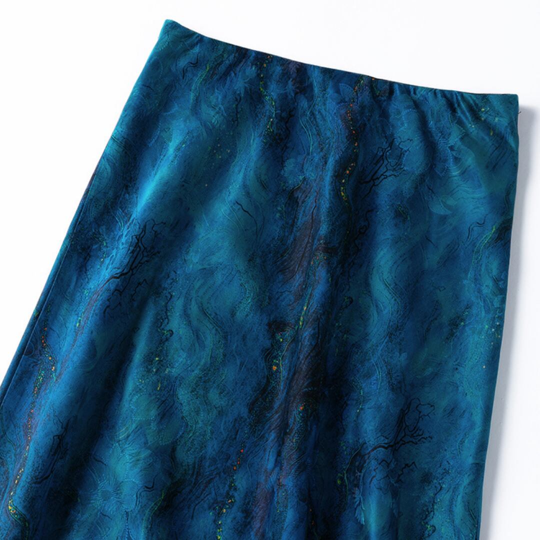 斜め裁ちデザインで、滑らかなラインが腰からヒップにかけて美しくフィットし、裾に向かって波打つマーメイドラインが広がります。