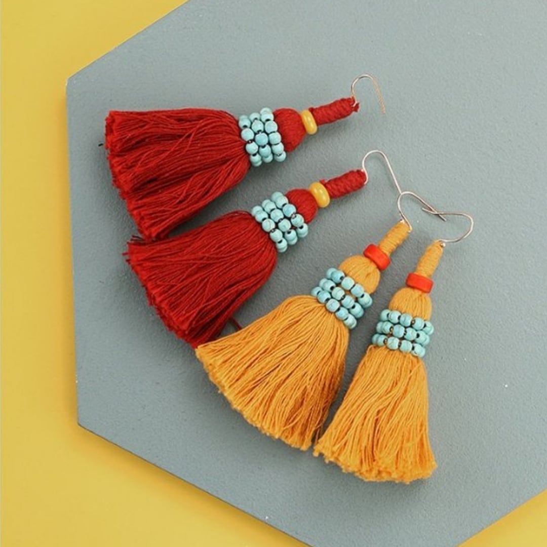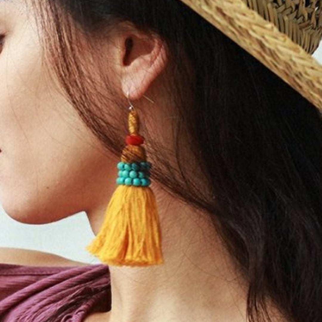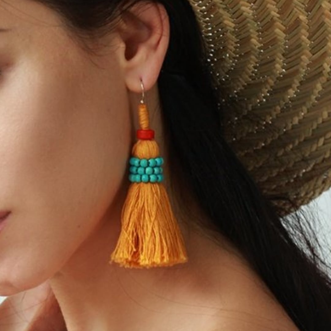 素材:ウール糸、ターコイズ風ビーズ、アンティークビーズ