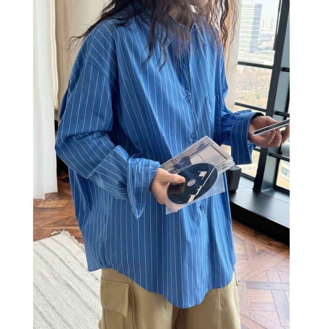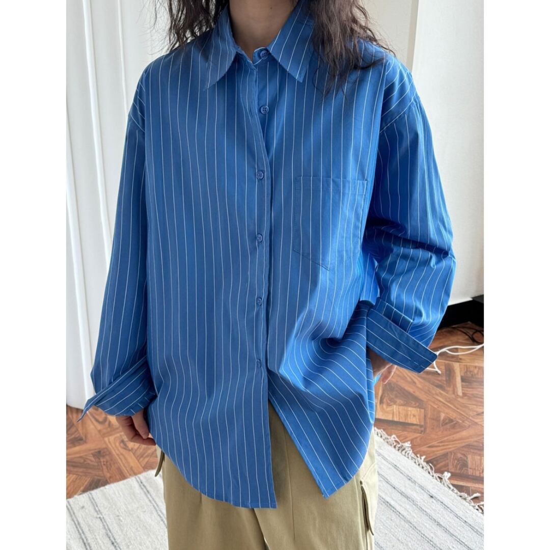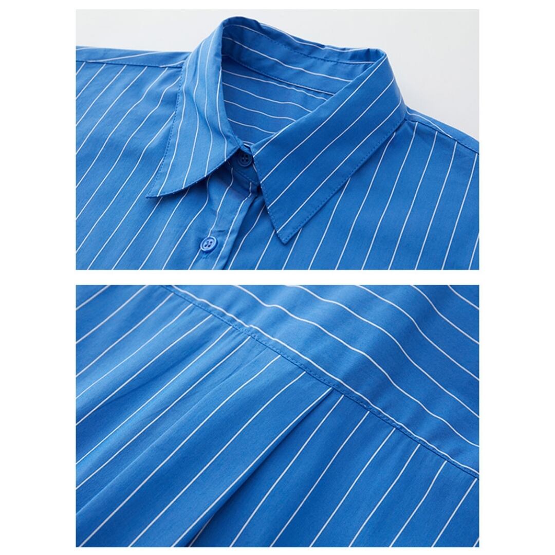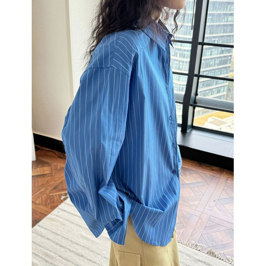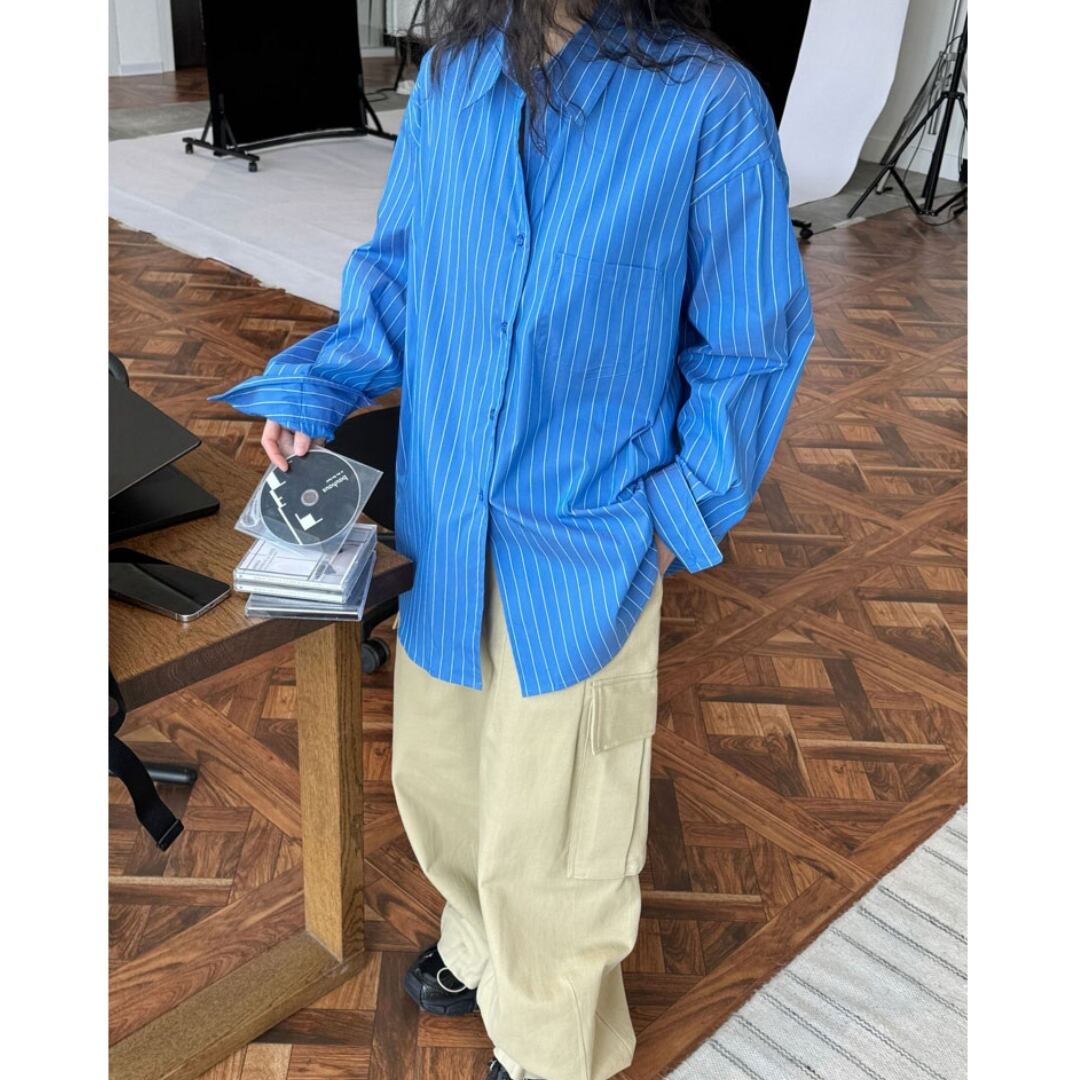 上品なピンストライプと絶妙なブルーのコントラスト。