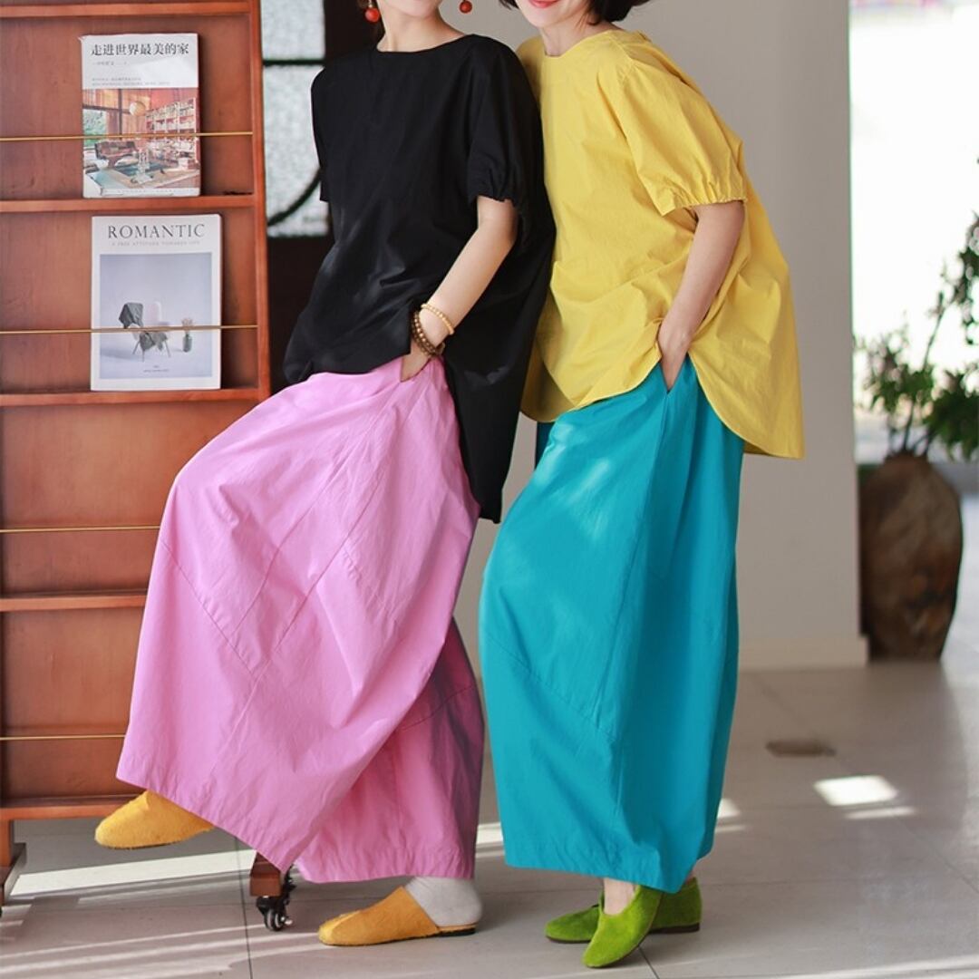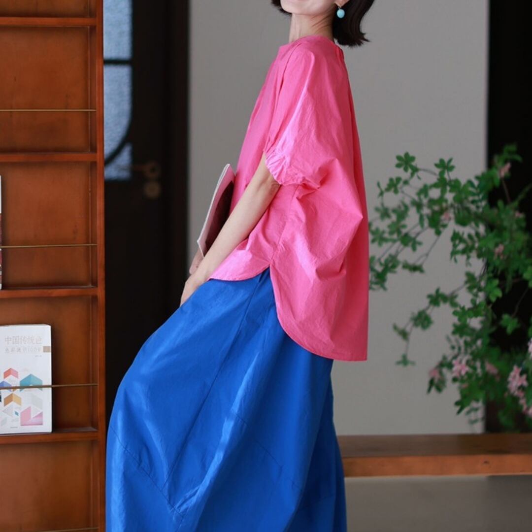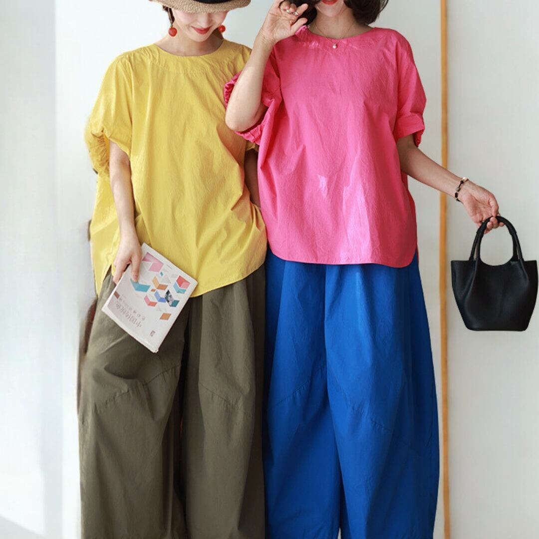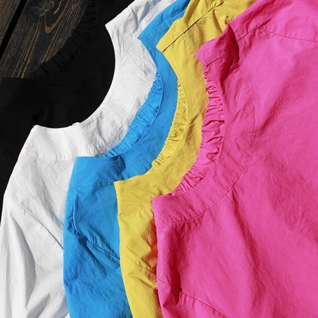 色で、気分を変える。 ふわりと風をまとったような、リズムあるシルエット。 ゆったりとした身頃と、ほんのり丸みを帯びた袖が 何気ない日常にも、さりげない個性を運んでくれます。 ネックラインには、小さなフリルの遊び心を。 シンプルだけれど、どこか記憶に残るデザイン。 ベーシックカラーで穏やかに、 ビビッドカラーで自分らしく。 SIZE: 【F】 胸囲:136cm 肩袖丈:34cm 着丈:前68cm/後75cm 袖口:34cm ※採寸方法により1~3cmの誤差がある場合がございます COLOR:5colors BLUE / PINK / YELLOW WHITE / BLACK 素材:コットン100% ※光の加減やモニターにより色味が異なる場合があります。 ※色移り防止のため、単独での冷水手洗いをおすすめします。 ※直射日光を避け、陰干ししてください。 ※モデル身長165cm/体重55kg ※IROPHORIAではお客様のご注文を受け1点1点商品を取り寄せしております。そのため、ご入金から発送までに1週間〜3週間前後お時間をいただきます。 余裕をもってのお買い求めをお願い致します。 ✦注意事項✦ ・タイミングによっては 商品在庫切れにより注文キャンセルとさせていただく恐れもございますので、予めご了承くださいませ。 ・海外製品のため日本とは製造基準が異なります。ご理解のうえご購入ください。 ・商品の色味は、お持ちのデバイス画面により実物と若干異なる場合がございます。 ・イメージ違いやサイズ等、お客様都合による交換、返品、キャンセルは対応出来かねます。 —————————————————— ⬇︎ ご購入前にこちらをお読みください https://shop.irophoria.tokyo/about ——————————————————